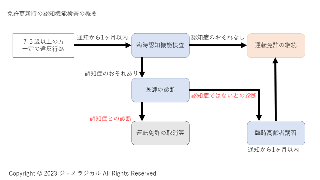 まずは認知機能に関する検査が2通りあるんだというイメージで良いかと思います。更新時と違反行為時ですね。いずれにしてもお知らせがあったのに忘れてすっぽかしてしまったら、自動車の運転はできなくなってしまうのでご注意ください。