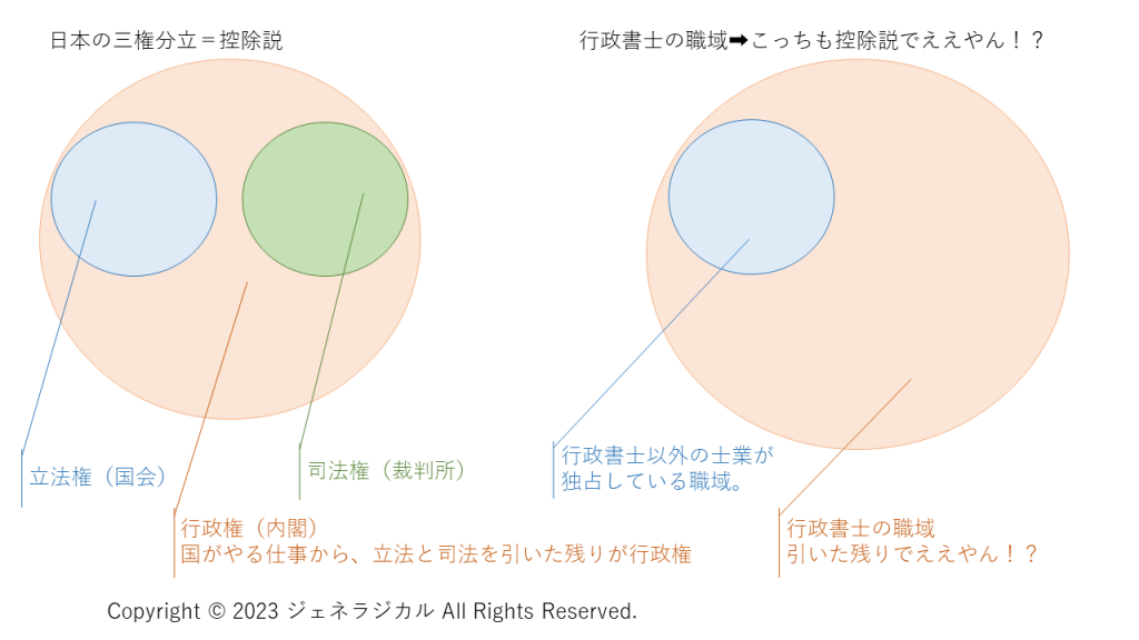 左の図で言えば、国がやる仕事の全体(橙色)から立法権と司法権(青色・緑色)を引いた残りの部分が行政権だというわけです(控除説)。