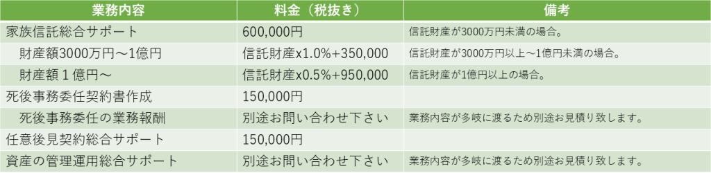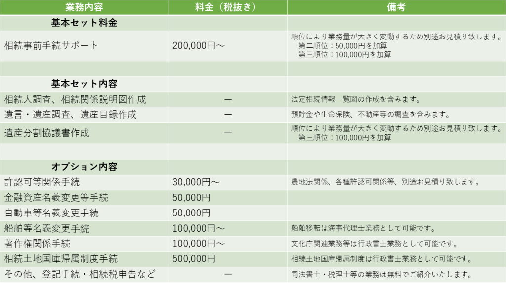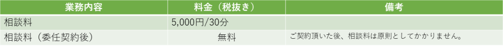 3 下記の料金表は全て弊社報酬です。その他に証明書や郵送費、交通費等の実費(立替金)が別途必要となります。改めてお見積りを出させて頂きますのでお気軽にお問い合わせください。